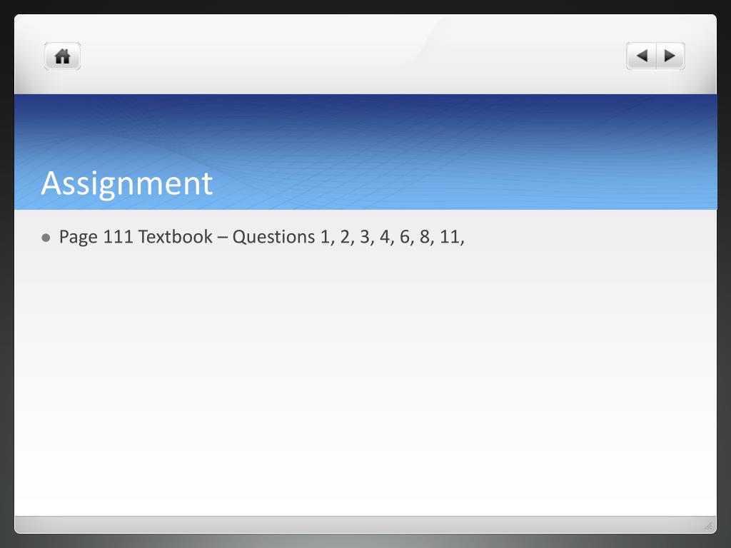 Assignment • Page 111 Textbook – Questions 1, 2, 3, 4, 6, 8, 11,