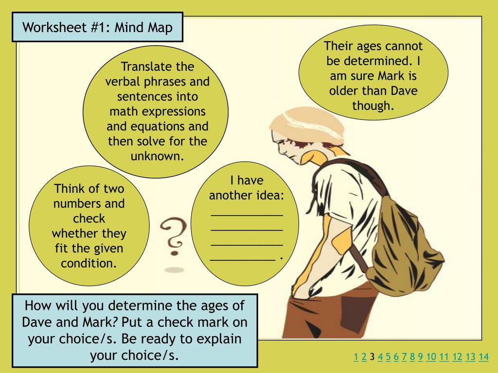 Worksheet #1: Mind Map Their ages cannot be determined. I am sure Mark is older than Dave though. Translate the verbal phrases and sentences into math expressions and equations and then solve for the unknown. I have another idea: ___________________________________________ . Think of two numbers and check whether they fit the given condition. How will you determine the ages of Dave and Mark? Put a check mark on your choice/s. Be ready to explain your choice/s. 12 3 4567891011121314