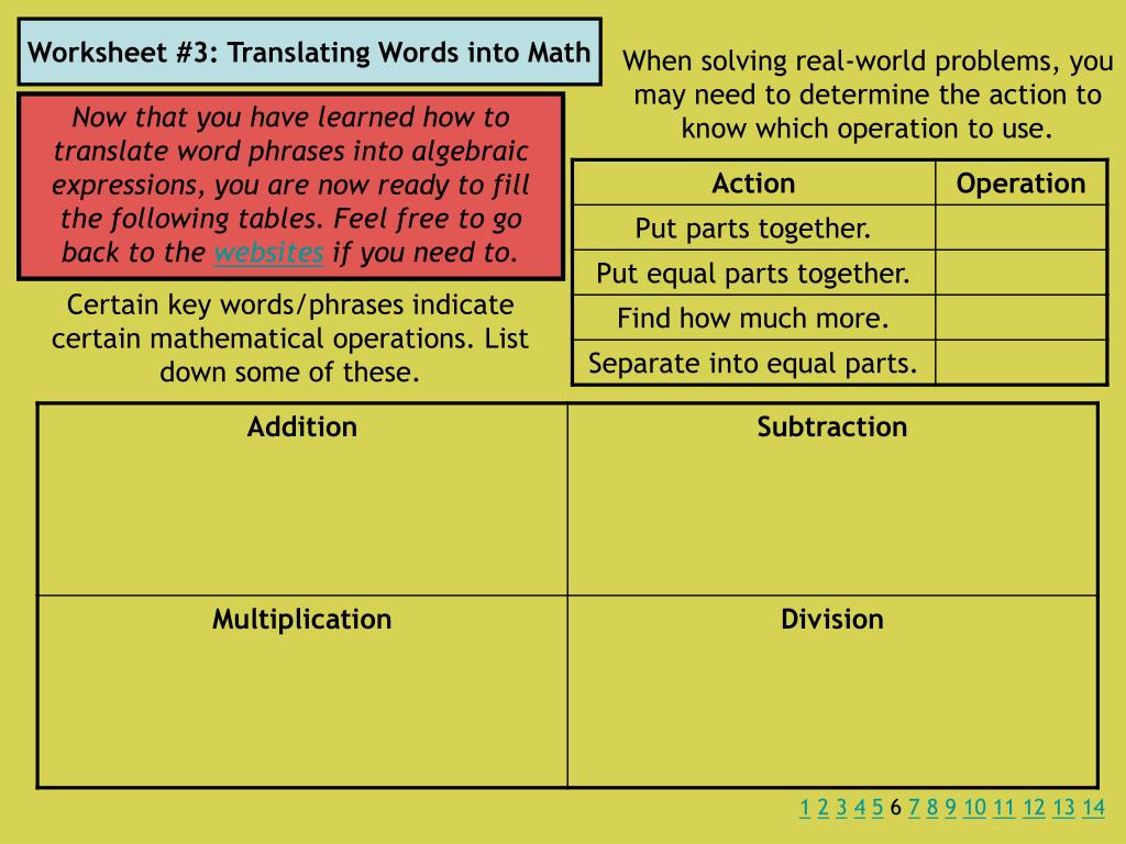 Worksheet #3: Translating Words into Math When solving real-world problems, you may need to determine the action to know which operation to use. Now that you have learned how to translate word phrases into algebraic expressions, you are now ready to fill the following tables. Feel free to go back to the websites if you need to. Certain key words/phrases indicate certain mathematical operations. List down some of these. 12345 6 7891011121314