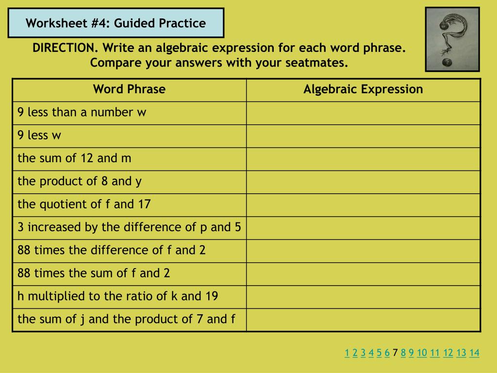 Worksheet #4: Guided Practice DIRECTION. Write an algebraic expression for each word phrase. Compare your answers with your seatmates. 123456 7 891011121314