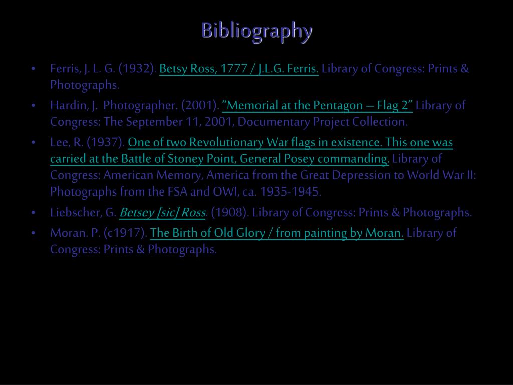 Bibliography • Ferris, J. L. G. (1932). Betsy Ross, 1777 / J.L.G. Ferris. Library of Congress: Prints & Photographs. • Hardin, J. Photographer. (2001). “Memorial at the Pentagon – Flag 2” Library of Congress: The September 11, 2001, Documentary Project Collection. • Lee, R. (1937). One of two Revolutionary War flags in existence. This one was carried at the Battle of Stoney Point, General Posey commanding. Library of Congress: American Memory, America from the Great Depression to World War II: Photographs from the FSA and OWI, ca. 1935-1945. • Liebscher, G. Betsey [sic] Ross. (1908). Library of Congress: Prints & Photographs. • Moran. P. (c1917). The Birth of Old Glory / from painting by Moran. Library of Congress: Prints & Photographs.
