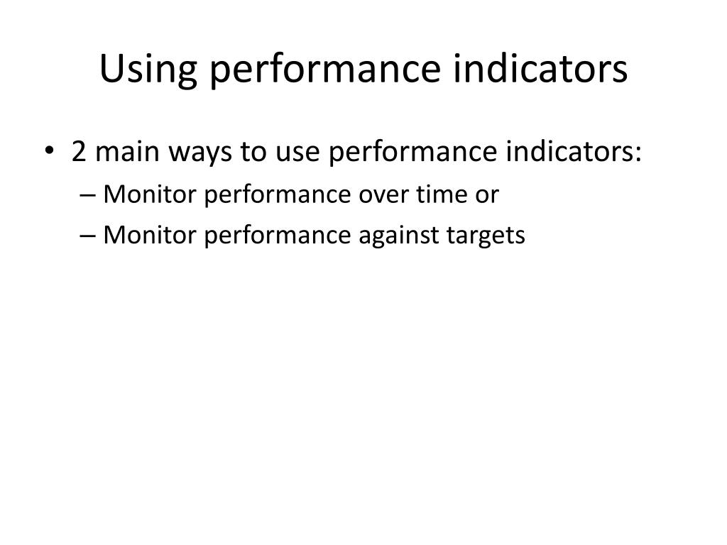 Using performance indicators • 2 main ways to use performance indicators: • Monitor performance over time or • Monitor performance against targets