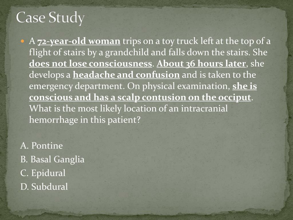 Case Study • A 72-year-old womantrips on a toy truck left at the top of a flight of stairs by a grandchild and falls down the stairs. She does not lose consciousness. About 36 hours later, she develops a headache and confusion and is taken to the emergency department. On physical examination, she is conscious and has a scalp contusion on the occiput. What is the most likely location of an intracranial hemorrhage in this patient? A. Pontine B. Basal Ganglia C. Epidural D. Subdural