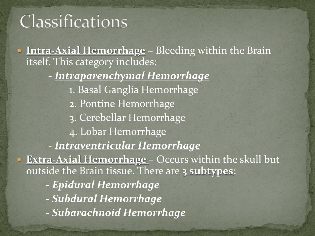 Classifications • Intra-Axial Hemorrhage – Bleeding within the Brain itself. This category includes: - Intraparenchymal Hemorrhage 1. Basal Ganglia Hemorrhage 2. Pontine Hemorrhage 3. Cerebellar Hemorrhage 4. Lobar Hemorrhage - Intraventricular Hemorrhage • Extra-Axial Hemorrhage – Occurs within the skull but outside the Brain tissue. There are 3 subtypes: - Epidural Hemorrhage - Subdural Hemorrhage - Subarachnoid Hemorrhage