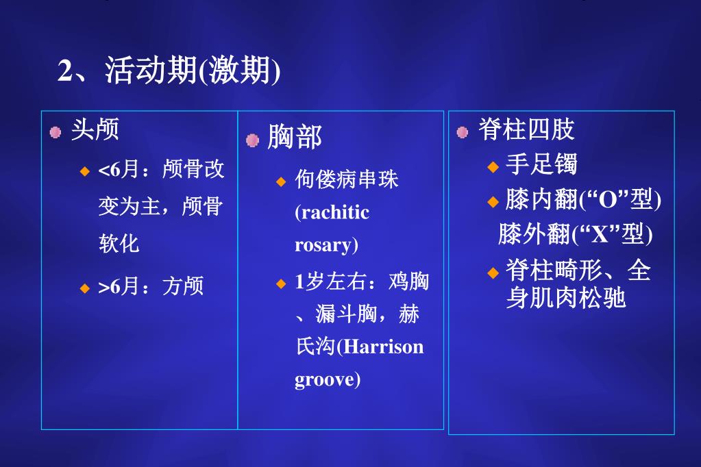 *[临床表现] 1、初期(早期):<6月,3月以内多见 • 神经兴奋性增高:激惹、烦闹、多汗、夜惊 • 无骨骼病变,骨骼X线可正常/钙化带稍模糊 • 25-(OH)D3↓,PTH↑,血Ca↓,P↓,ALP正常/稍高
