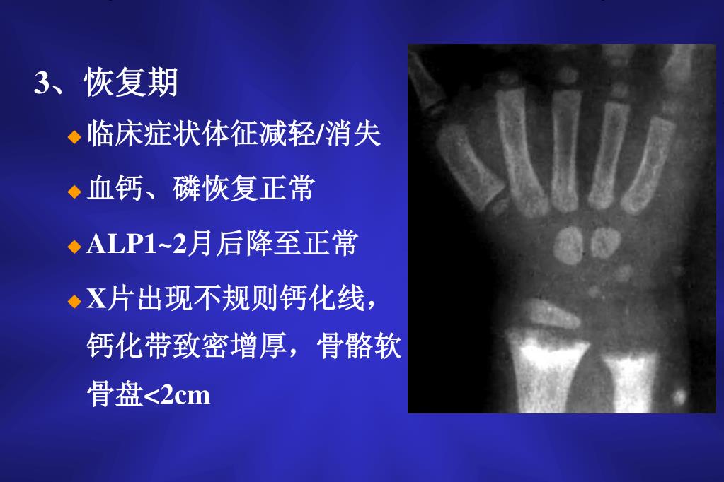 3、恢复期 • 临床症状体征减轻/消失 • 血钙、磷恢复正常 • ALP1~2月后降至正常 • X片出现不规则钙化线,钙化带致密增厚,骨骼软骨盘<2cm