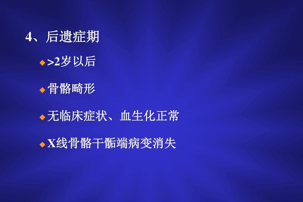 4、后遗症期 • >2岁以后 • 骨骼畸形 • 无临床症状、血生化正常 • X线骨骼干骺端病变消失