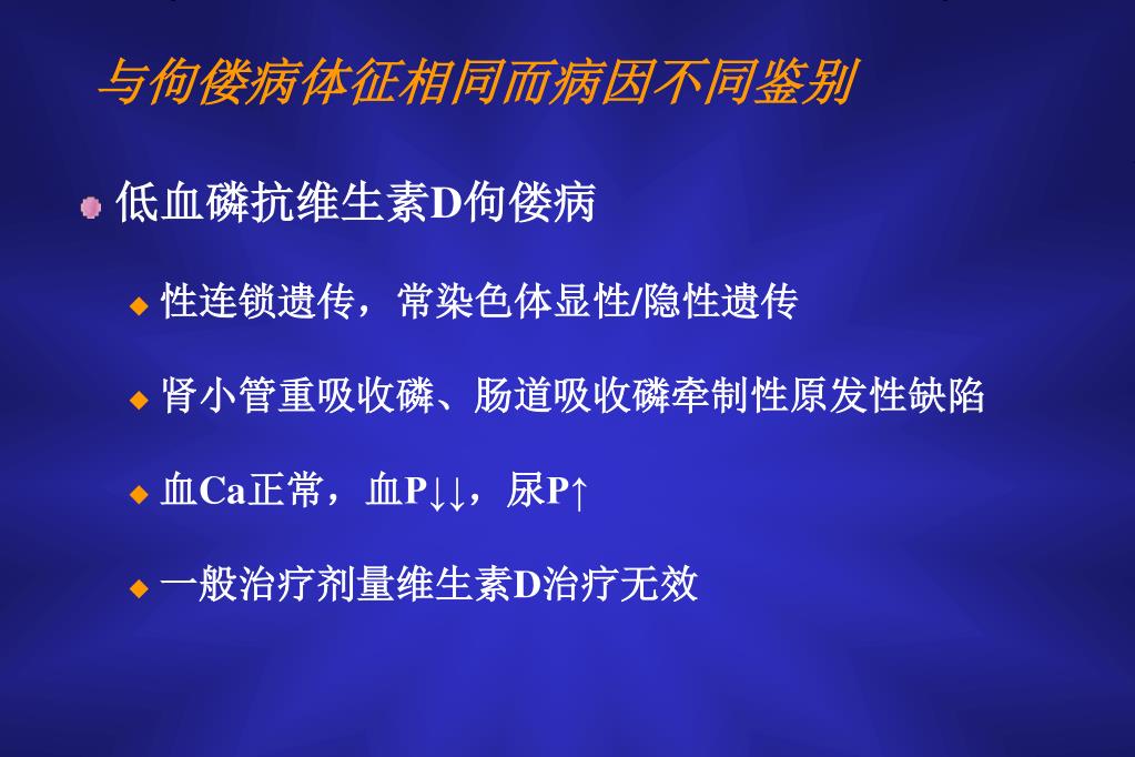 与佝偻病体征相同而病因不同鉴别 • 低血磷抗维生素D佝偻病 • 性连锁遗传,常染色体显性/隐性遗传 • 肾小管重吸收磷、肠道吸收磷牵制性原发性缺陷 • 血Ca正常,血P↓↓,尿P↑ • 一般治疗剂量维生素D治疗无效