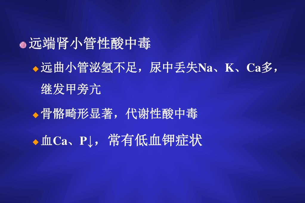 远端肾小管性酸中毒 • 远曲小管泌氢不足,尿中丢失Na、K、Ca多,继发甲旁亢 • 骨骼畸形显著,代谢性酸中毒 • 血Ca、P↓,常有低血钾症状