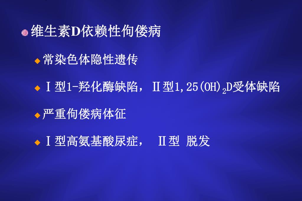 维生素D依赖性佝偻病 • 常染色体隐性遗传 • Ⅰ型1-羟化酶缺陷,Ⅱ型1,25(OH)2D受体缺陷 • 严重佝偻病体征 • Ⅰ型高氨基酸尿症, Ⅱ型 脱发