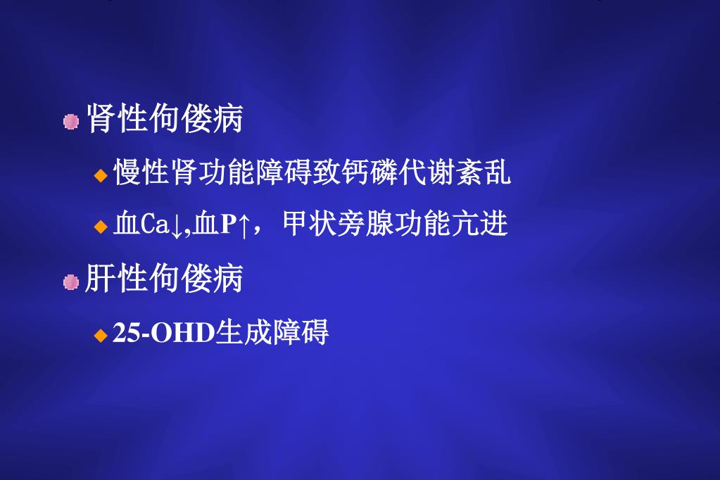 肾性佝偻病 • 慢性肾功能障碍致钙磷代谢紊乱 • 血Ca↓,血P↑,甲状旁腺功能亢进 • 肝性佝偻病 • 25-OHD生成障碍