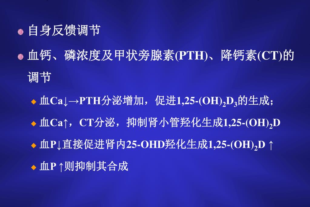 自身反馈调节 • 血钙、磷浓度及甲状旁腺素(PTH)、降钙素(CT)的调节 • 血Ca↓→PTH分泌增加,促进1,25-(OH)2D3的生成; • 血Ca↑,CT分泌,抑制肾小管羟化生成1,25-(OH)2D • 血P↓直接促进肾内25-OHD羟化生成1,25-(OH)2D ↑ • 血P ↑则抑制其合成