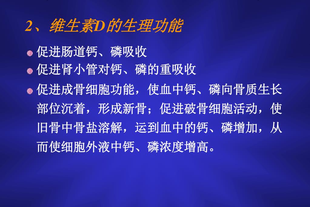 2、维生素D的生理功能 • 促进肠道钙、磷吸收 • 促进肾小管对钙、磷的重吸收 • 促进成骨细胞功能,使血中钙、磷向骨质生长部位沉着,形成新骨;促进破骨细胞活动,使旧骨中骨盐溶解,运到血中的钙、磷增加,从而使细胞外液中钙、磷浓度增高。