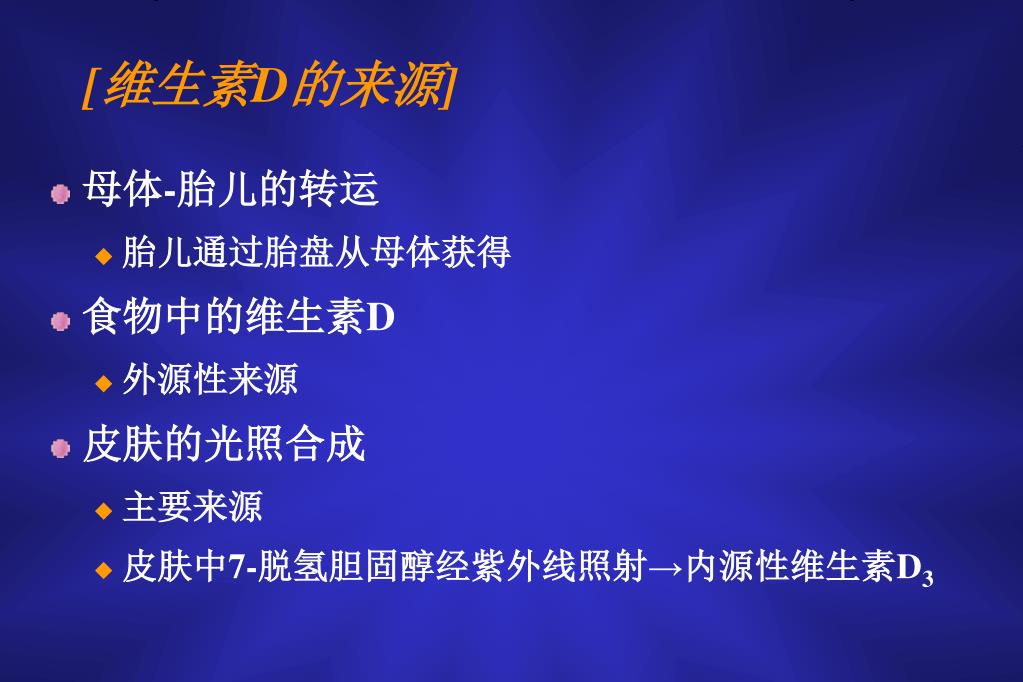 [维生素D的来源] • 母体-胎儿的转运 • 胎儿通过胎盘从母体获得 • 食物中的维生素D • 外源性来源 • 皮肤的光照合成 • 主要来源 • 皮肤中7-脱氢胆固醇经紫外线照射→内源性维生素D3