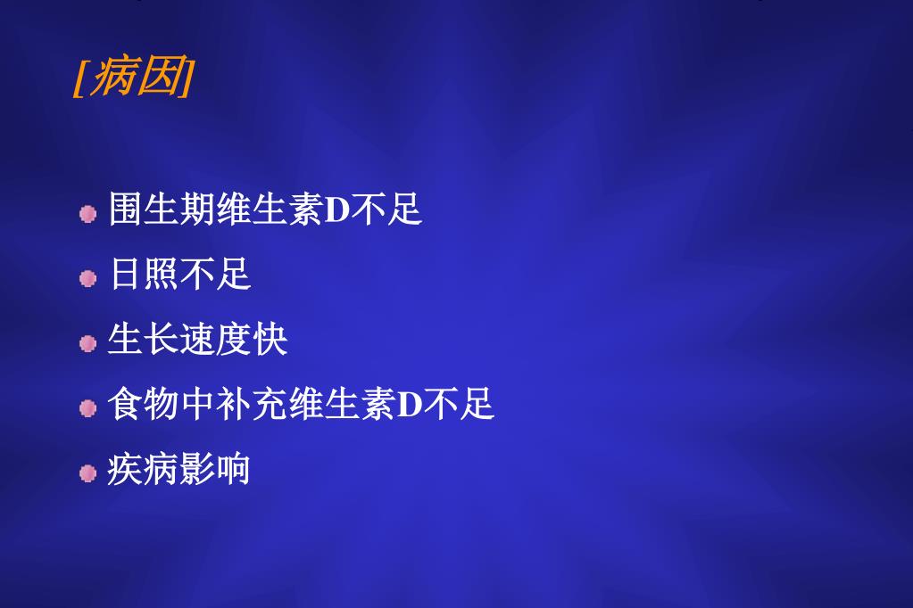 [病因] • 围生期维生素D不足 • 日照不足 • 生长速度快 • 食物中补充维生素D不足 • 疾病影响