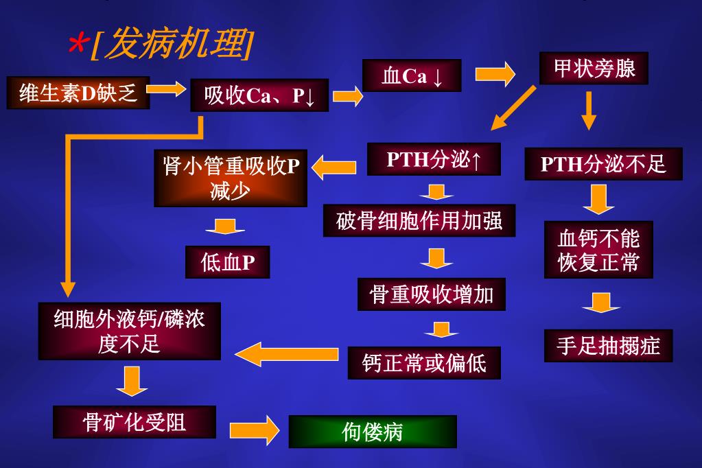 *[发病机理] 甲状旁腺 血Ca ↓ 维生素D缺乏 吸收Ca、P↓ PTH分泌↑ PTH分泌不足 肾小管重吸收P减少 破骨细胞作用加强 血钙不能恢复正常 低血P 骨重吸收增加 细胞外液钙/磷浓度不足 手足抽搦症 钙正常或偏低 骨矿化受阻 佝偻病