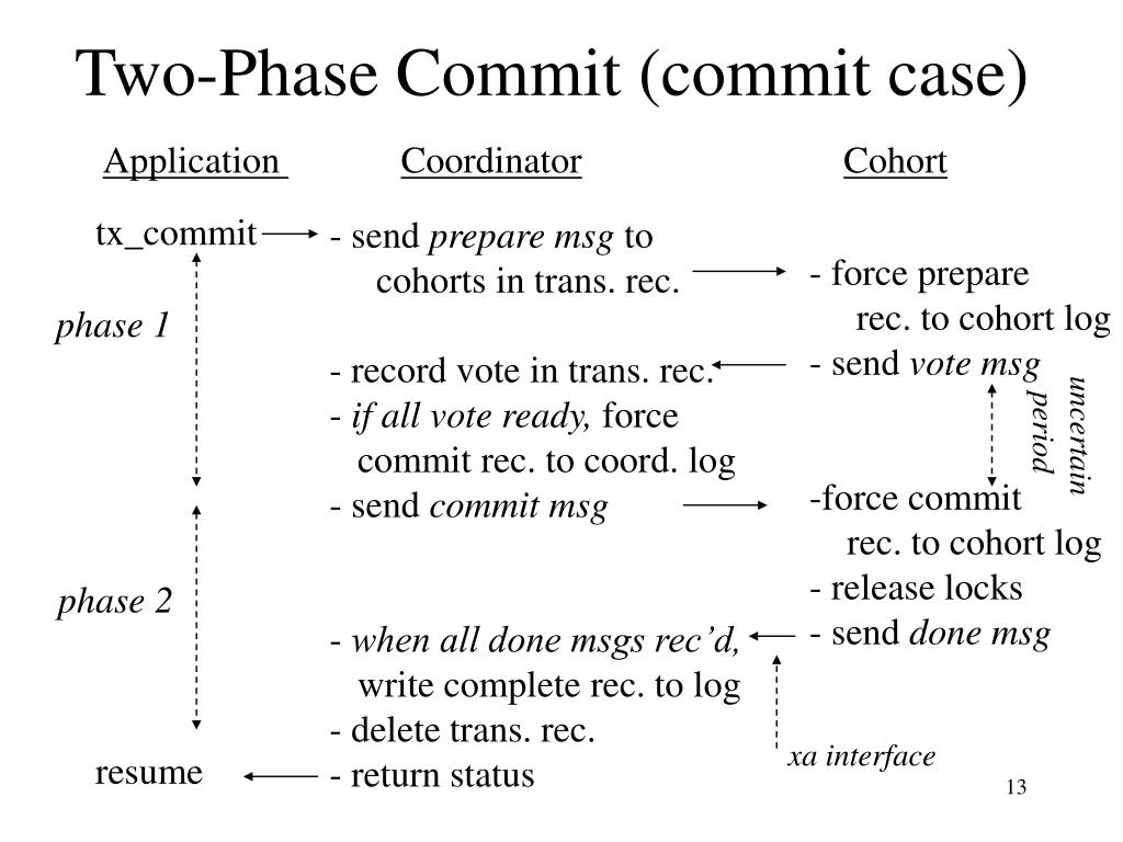 Two-Phase Commit (commit case) Application CoordinatorCohort tx_commit resume • - send prepare msg to • cohorts in trans. rec. • - record vote in trans. rec. • if all vote ready, force • commit rec. to coord. log • - send commit msg • when all done msgs rec’d, • write complete rec. to log • - delete trans. rec. • - return status • - force prepare • rec. to cohort log • - send vote msg • force commit • rec. to cohort log • - release locks • - send done msg phase 1 uncertain period phase 2 xa interface