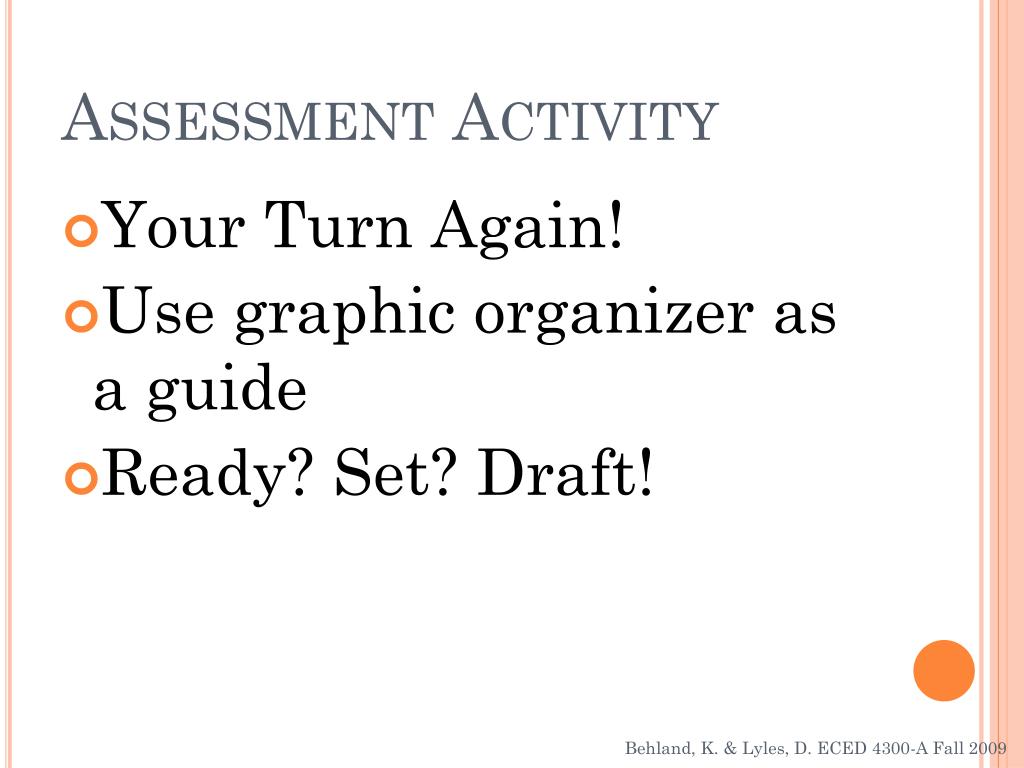 Assessment Activity • Your Turn Again! • Use graphic organizer as a guide • Ready? Set? Draft! Behland, K. & Lyles, D. ECED 4300-A Fall 2009