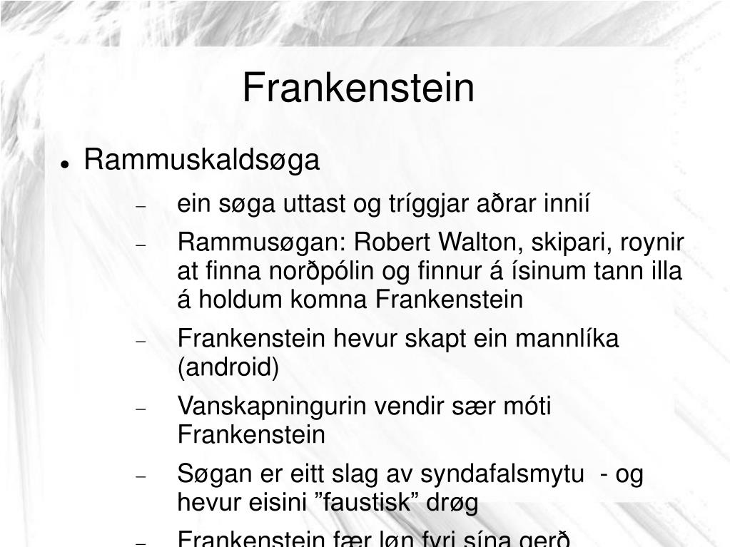 Frankenstein Rammuskaldsøga ein søga uttast og tríggjar aðrar innií Rammusøgan: Robert Walton, skipari, roynir at finna norðpólin og finnur á ísinum tann illa á holdum komna Frankenstein Frankenstein hevur skapt ein mannlíka (android) Vanskapningurin vendir sær móti Frankenstein Søgan er eitt slag av syndafalsmytu - og hevur eisini ”faustisk” drøg Frankenstein fær løn fyri sína gerð