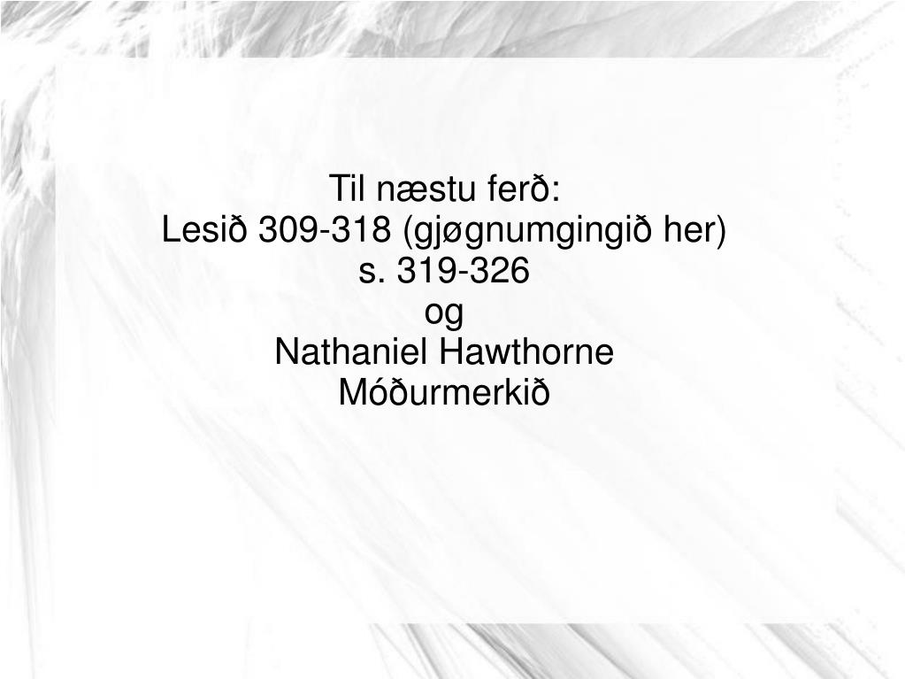 Til næstu ferð: Lesið 309-318 (gjøgnumgingið her) s. 319-326 og Nathaniel Hawthorne Móðurmerkið