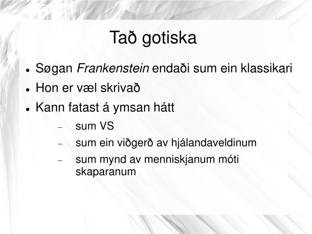 Tað gotiska Søgan Frankenstein endaði sum ein klassikari Hon er væl skrivað Kann fatast á ymsan hátt sum VS sum ein viðgerð av hjálandaveldinum sum mynd av menniskjanum móti skaparanum