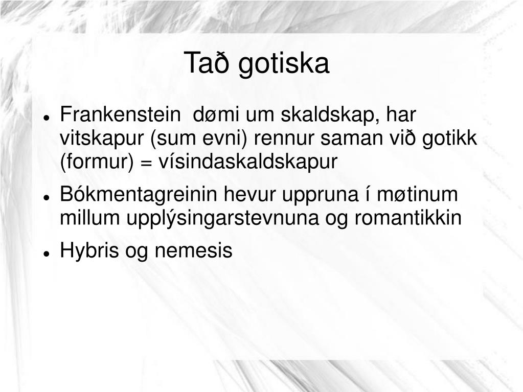 Tað gotiska Frankenstein dømi um skaldskap, har vitskapur (sum evni) rennur saman við gotikk (formur) = vísindaskaldskapur Bókmentagreinin hevur uppruna í møtinum millum upplýsingarstevnuna og romantikkin Hybris og nemesis
