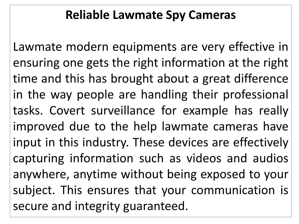 Reliable Lawmate Spy Cameras Lawmate modern equipments are very effective in ensuring one gets the right information at the right time and this has brought about a great difference in the way people are handling their professional tasks. Covert surveillance for example has really improved due to the help lawmate cameras have input in this industry. These devices are effectively capturing information such as videos and audios anywhere, anytime without being exposed to your subject. This ensures that your communication is secure and integrity guaranteed.
