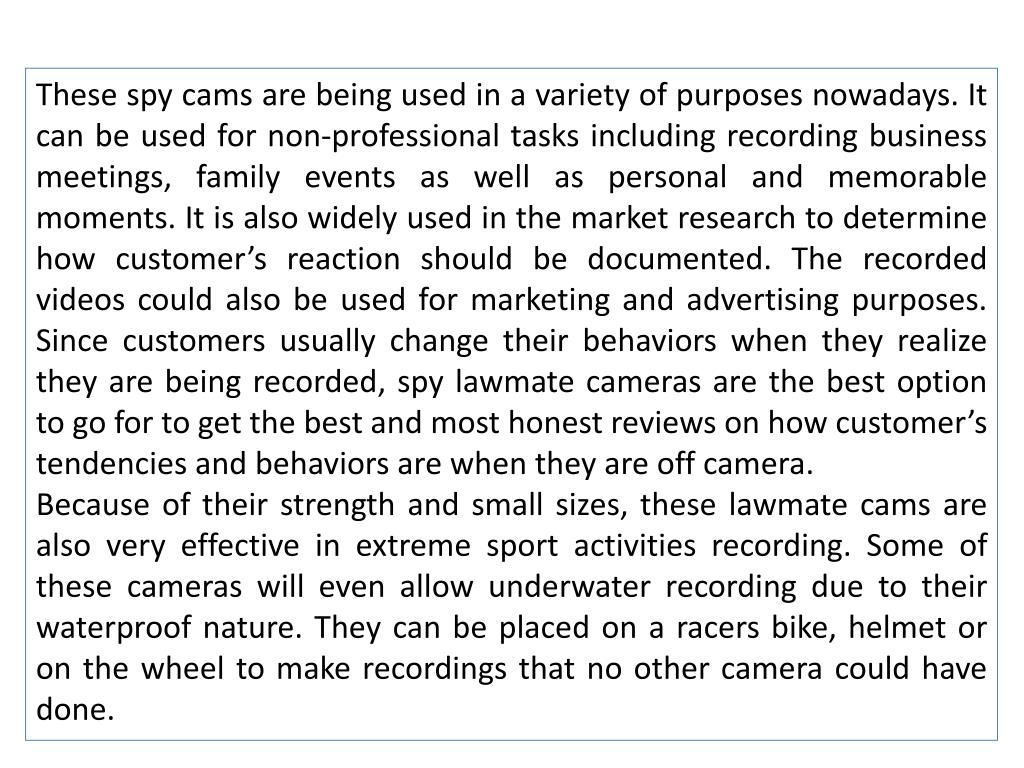 These spy cams are being used in a variety of purposes nowadays. It can be used for non-professional tasks including recording business meetings, family events as well as personal and memorable moments. It is also widely used in the market research to determine how customer’s reaction should be documented. The recorded videos could also be used for marketing and advertising purposes. Since customers usually change their behaviors when they realize they are being recorded, spy lawmate cameras are the best option to go for to get the best and most honest reviews on how customer’s tendencies and behaviors are when they are off camera. Because of their strength and small sizes, these lawmate cams are also very effective in extreme sport activities recording. Some of these cameras will even allow underwater recording due to their waterproof nature. They can be placed on a racers bike, helmet or on the wheel to make recordings that no other camera could have done.