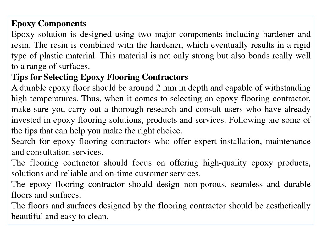 Epoxy Components • Epoxy solution is designed using two major components including hardener and resin. The resin is combined with the hardener, which eventually results in a rigid type of plastic material. This material is not only strong but also bonds really well to a range of surfaces. • Tips for Selecting Epoxy Flooring Contractors • A durable epoxy floor should be around 2 mm in depth and capable of withstanding high temperatures. Thus, when it comes to selecting an epoxy flooring contractor, make sure you carry out a thorough research and consult users who have already invested in epoxy flooring solutions, products and services. Following are some of the tips that can help you make the right choice. • Search for epoxy flooring contractors who offer expert installation, maintenance and consultation services. • The flooring contractor should focus on offering high-quality epoxy products, solutions and reliable and on-time customer services. • The epoxy flooring contractor should design non-porous, seamless and durable floors and surfaces. • The floors and surfaces designed by the flooring contractor should be aesthetically beautiful and easy to clean.