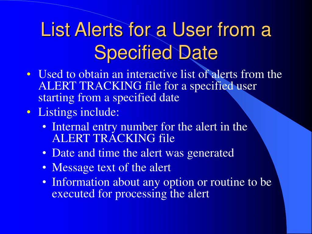 List Alerts for a User from a Specified Date • Used to obtain an interactive list of alerts from the ALERT TRACKING file for a specified user starting from a specified date • Listings include: • Internal entry number for the alert in the ALERT TRACKING file • Date and time the alert was generated • Message text of the alert • Information about any option or routine to be executed for processing the alert