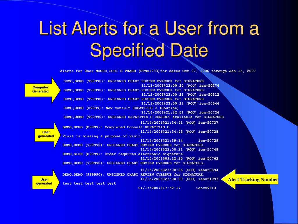 List Alerts for a User from a Specified Date Alerts for User MOORE,LORI B PHARM (DFN=1983)for dates Oct 07, 2006 through Jan 15, 2007 DEMO,DEMO (999990): UNSIGNED CHART REVIEW OVERDUE for SIGNATURE. 11/11/2006@23:00:20 [ROU] ien=50274 DEMO,DEMO (999990): UNSIGNED CHART REVIEW OVERDUE for SIGNATURE. 11/12/2006@23:00:21 [ROU] ien=50312 DEMO,DEMO (999990): UNSIGNED CHART REVIEW OVERDUE for SIGNATURE. 11/13/2006@23:00:22 [ROU] ien=50546 DEMO,DEMO (D9999): New consult HEPATITIS C (Routine) 11/14/2006@21:32:51 [ROU] ien=50726 DEMO,DEMO (999990): UNSIGNED HEPATITIS C CONSULT available for SIGNATURE. Computer Generated 11/14/2006@21:34:41 [ROU] ien=50727 DEMO,DEMO (D9999): Completed Consult HEPATITIS C 11/14/2006@21:34:43 [ROU] ien=50728 Visit is missing a purpose of visit. 11/14/2006@21:39:14 ien=50729 DEMO,DEMO (999990): UNSIGNED CHART REVIEW OVERDUE for SIGNATURE. 11/14/2006@23:00:21 [ROU] ien=50748 DEMO,GLEN (D9999): Order requires electronic signature. 11/15/2006@09:12:35 [ROU] ien=50762 DEMO,DEMO (999990): UNSIGNED CHART REVIEW OVERDUE for SIGNATURE. User generated 11/15/2006@23:00:26 [ROU] ien=50894 DEMO,DEMO (999990): UNSIGNED CHART REVIEW OVERDUE for SIGNATURE. 11/16/2006@23:00:20 [ROU] ien=51093 test test test test test 01/17/2007@17:52:17 ien=59613 User generated Alert Tracking Number