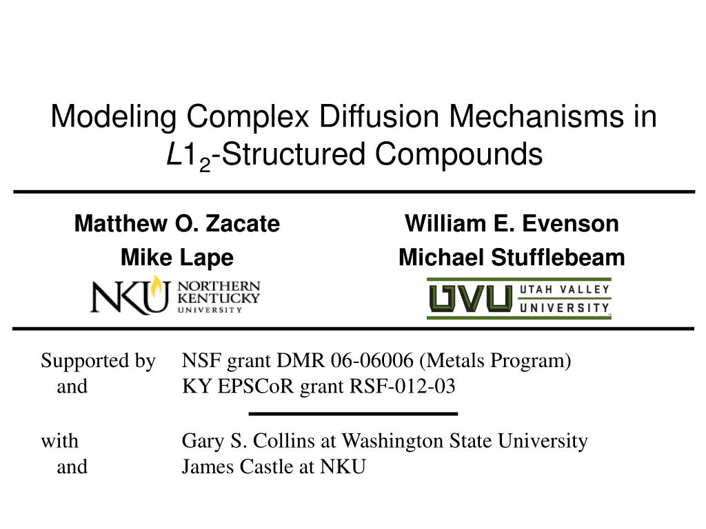 Modeling Complex Diffusion Mechanisms in L12-Structured Compounds Matthew O. Zacate William E. Evenson Mike Lape Michael Stufflebeam Supported by NSF grant DMR 06-06006 (Metals Program) and KY EPSCoR grant RSF-012-03 with Gary S. Collins at Washington State University and James Castle at NKU