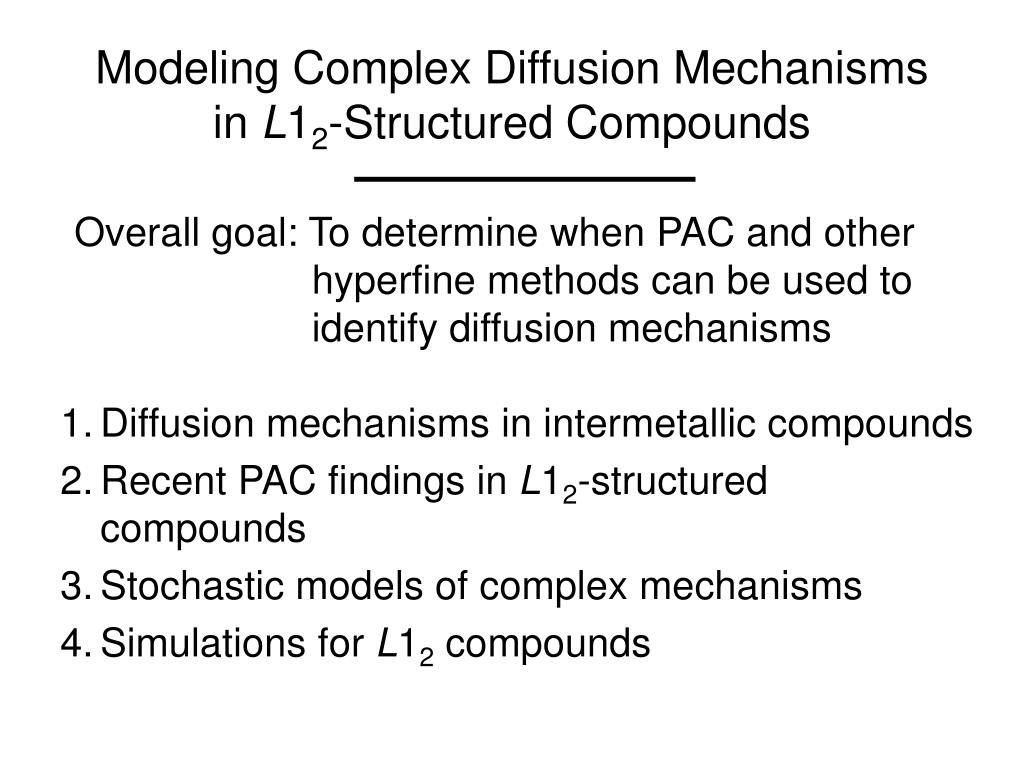 Modeling Complex Diffusion Mechanisms in L12-Structured Compounds Overall goal: To determine when PAC and other hyperfine methods can be used to identify diffusion mechanisms • Diffusion mechanisms in intermetallic compounds • Recent PAC findings in L12-structured compounds • Stochastic models of complex mechanisms • Simulations for L12 compounds