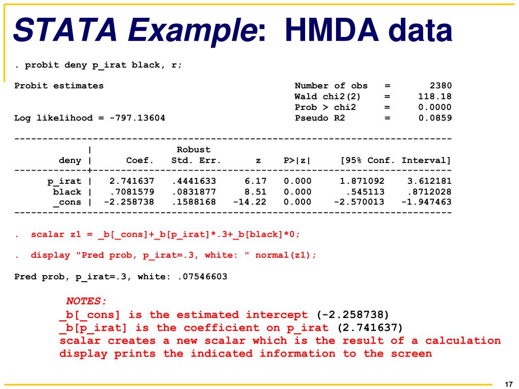 Probit model: Application Arcidiacono and Vigdor (2010). “Does the River Spill Over? Estimating the Economic Returns to Attending a Racially Diverse College.” Economic Inquiry 48(3): 537 – 557. • Does “diversity capital” matter and does minority representation increase it? • Does diversity improve post-graduate outcomes of non-minority students? • College & Beyond survey, starting college in 1976