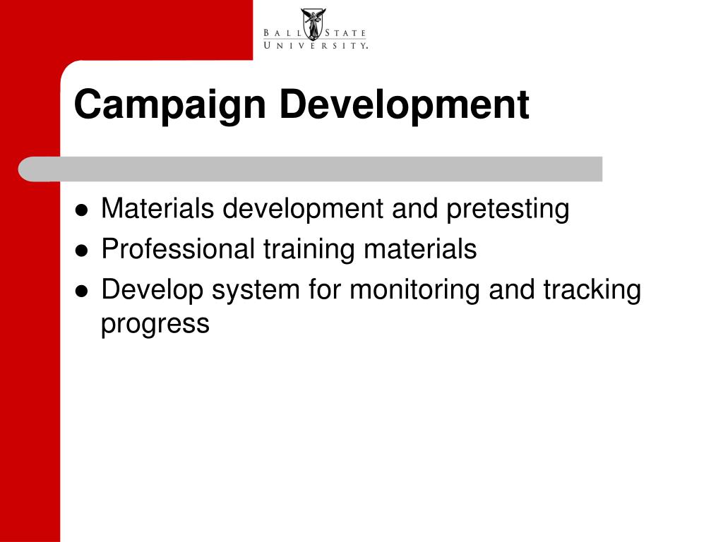 Campaign Development • Materials development and pretesting • Professional training materials • Develop system for monitoring and tracking progress