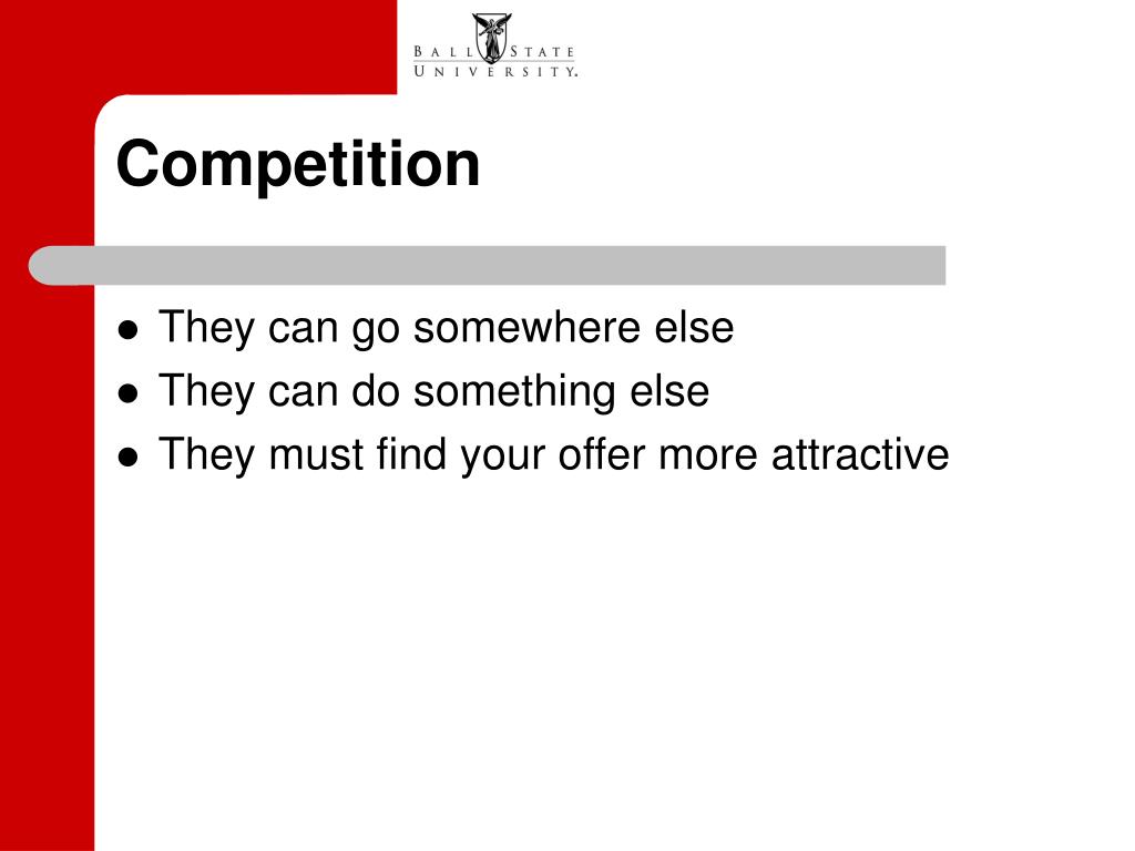 Competition • They can go somewhere else • They can do something else • They must find your offer more attractive