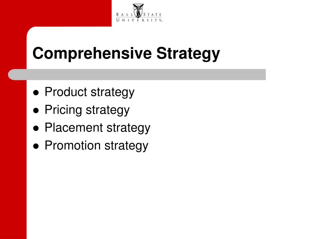 Comprehensive Strategy • Product strategy • Pricing strategy • Placement strategy • Promotion strategy