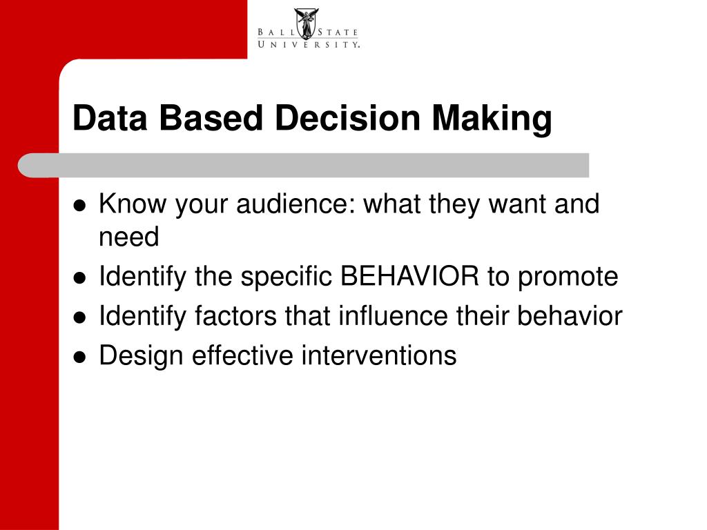 Data Based Decision Making • Know your audience: what they want and need • Identify the specific BEHAVIOR to promote • Identify factors that influence their behavior • Design effective interventions