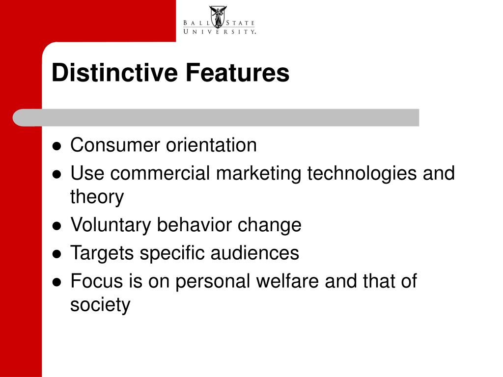 Distinctive Features • Consumer orientation • Use commercial marketing technologies and theory • Voluntary behavior change • Targets specific audiences • Focus is on personal welfare and that of society