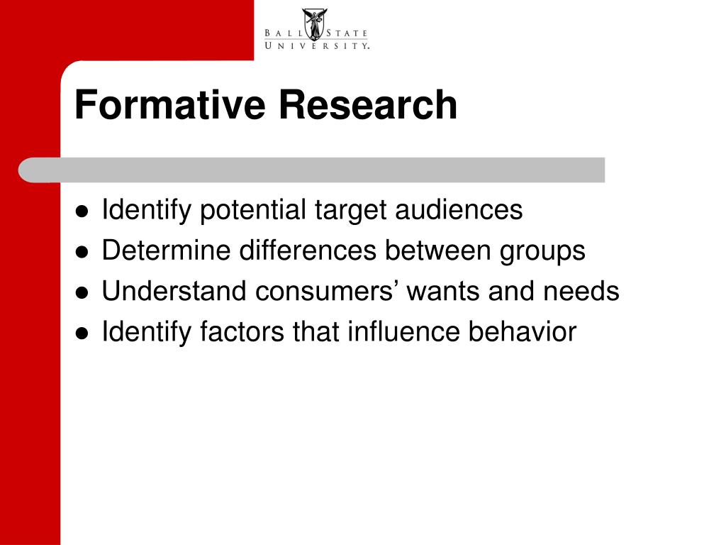 Formative Research • Identify potential target audiences • Determine differences between groups • Understand consumers’ wants and needs • Identify factors that influence behavior
