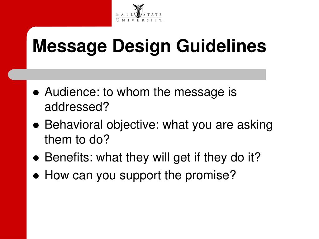 Message Design Guidelines • Audience: to whom the message is addressed? • Behavioral objective: what you are asking them to do? • Benefits: what they will get if they do it? • How can you support the promise?