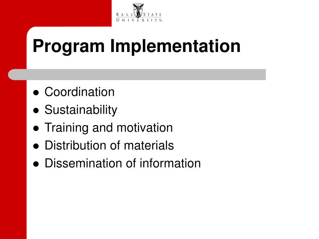 Program Implementation • Coordination • Sustainability • Training and motivation • Distribution of materials • Dissemination of information