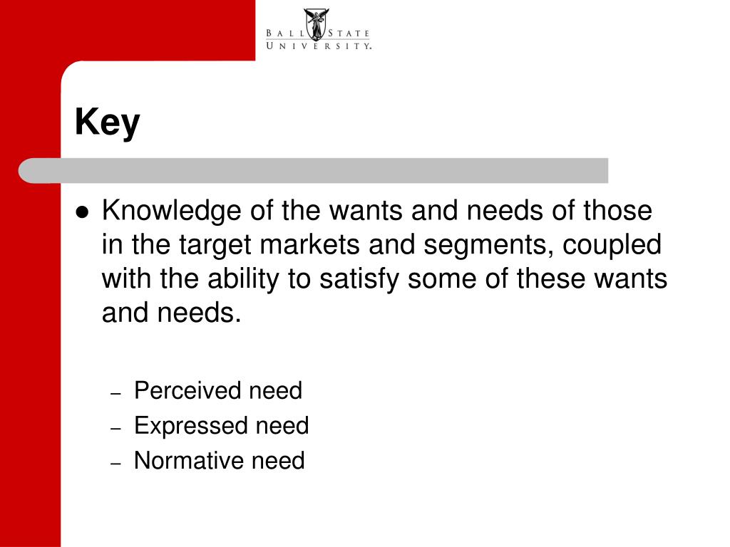Key • Knowledge of the wants and needs of those in the target markets and segments, coupled with the ability to satisfy some of these wants and needs. • Perceived need • Expressed need • Normative need