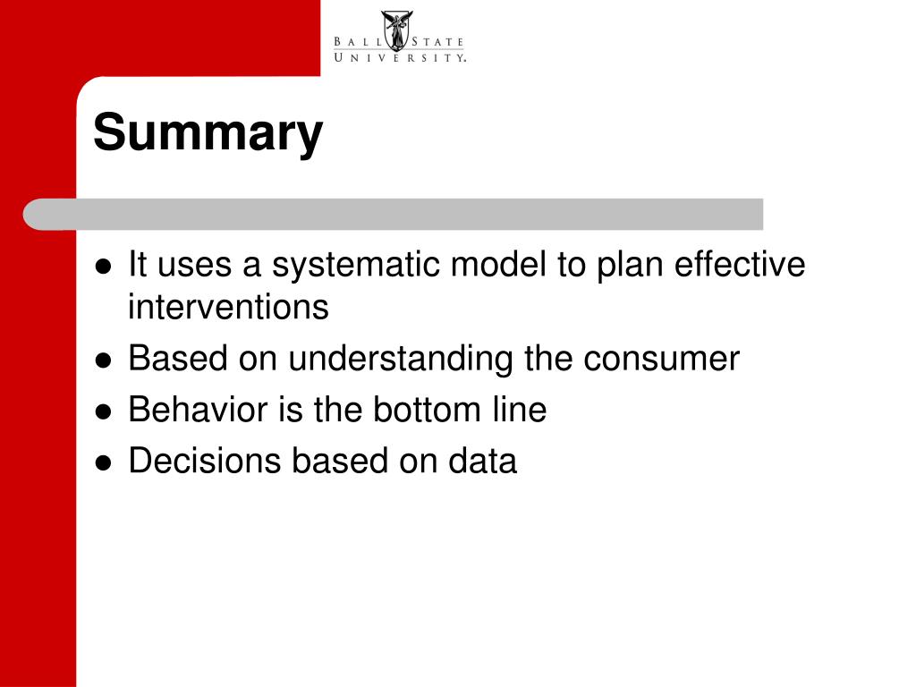 Summary • It uses a systematic model to plan effective interventions • Based on understanding the consumer • Behavior is the bottom line • Decisions based on data