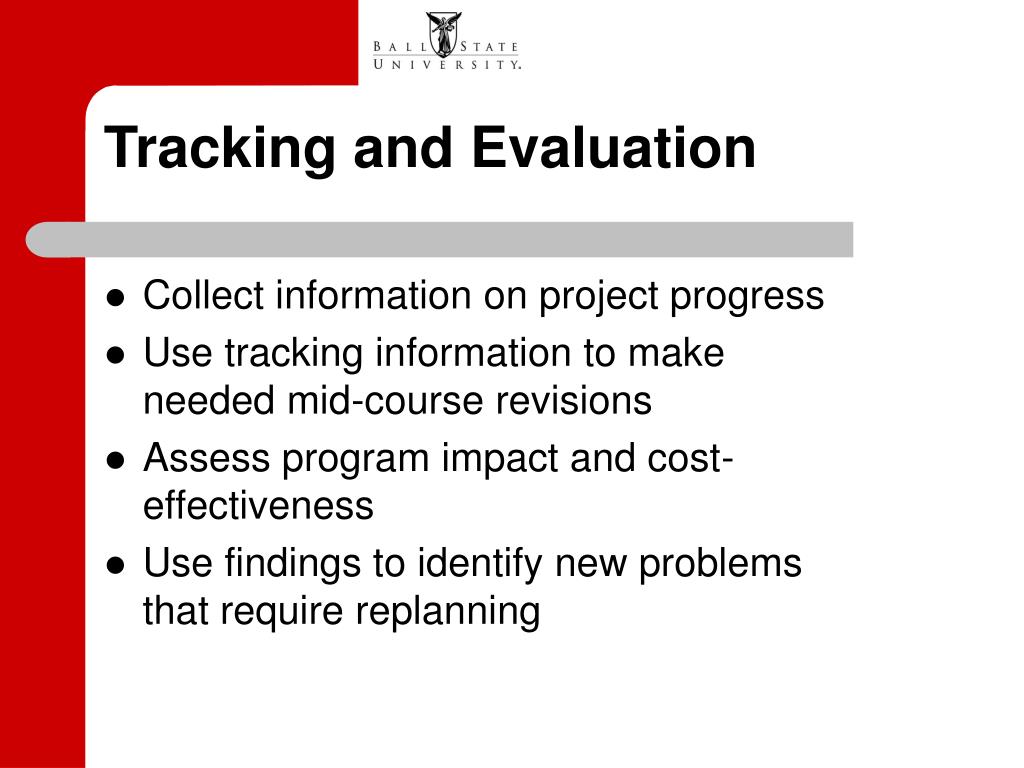 Tracking and Evaluation • Collect information on project progress • Use tracking information to make needed mid-course revisions • Assess program impact and cost-effectiveness • Use findings to identify new problems that require replanning
