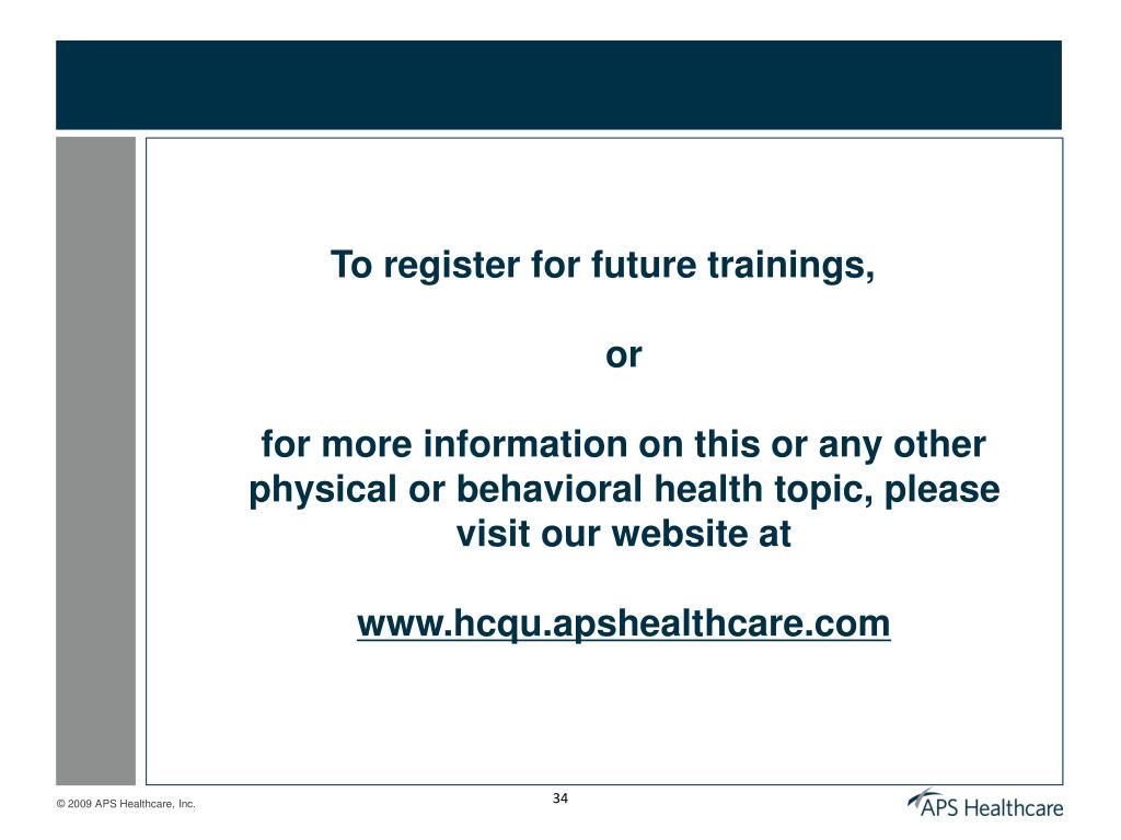 To register for future trainings,orfor more information on this or any other physical or behavioral health topic, please visit our website at www.hcqu.apshealthcare.com