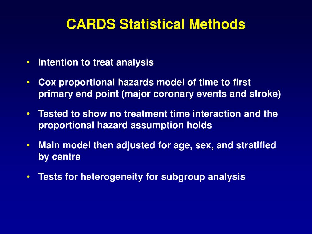 CARDS Statistical Methods • Intention to treat analysis • Cox proportional hazards model of time to first primary end point (major coronary events and stroke) • Tested to show no treatment time interaction and the proportional hazard assumption holds • Main model then adjusted for age, sex, and stratified by centre • Tests for heterogeneity for subgroup analysis