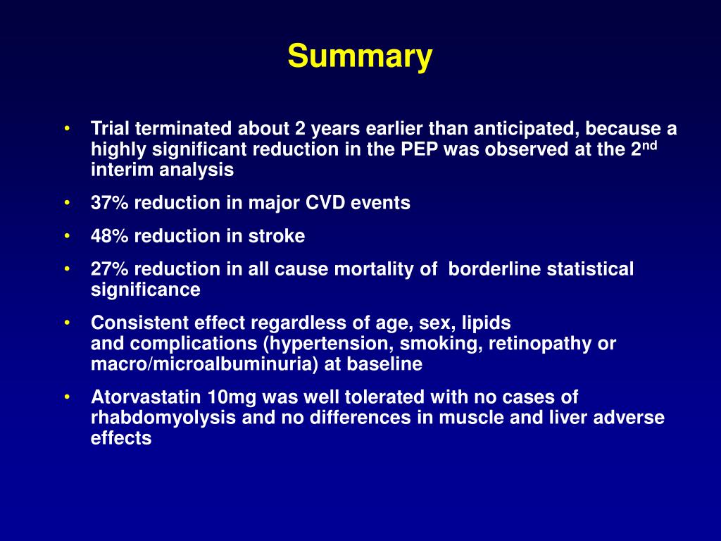 Summary • Trial terminated about 2 years earlier than anticipated, because a highly significant reduction in the PEP was observed at the 2nd interim analysis • 37% reduction in major CVD events • 48% reduction in stroke • 27% reduction in all cause mortality of borderline statistical significance • Consistent effect regardless of age, sex, lipids and complications (hypertension, smoking, retinopathy or macro/microalbuminuria) at baseline • Atorvastatin 10mg was well tolerated with no cases of rhabdomyolysis and no differences in muscle and liver adverse effects