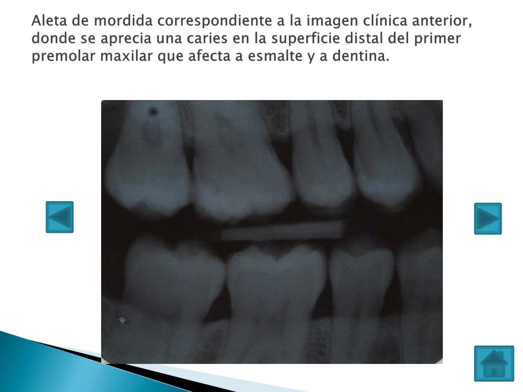 Aleta de mordida correspondiente a la imagen clínica anterior, donde se aprecia una caries en la superficie distal del primer premolar maxilar que afecta a esmalte y a dentina.