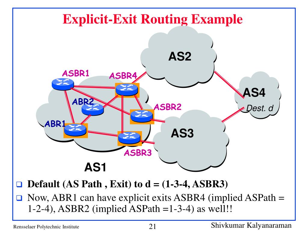 AS2 ASBR1 ASBR4 AS4 Dest. d ABR2 ASBR2 ABR1 AS3 ASBR3 AS1 Explicit-Exit Routing Example • Default (AS Path , Exit) to d = (1-3-4, ASBR3) • Now, ABR1 can have explicit exits ASBR4 (implied ASPath = 1-2-4), ASBR2 (implied ASPath =1-3-4) as well!!